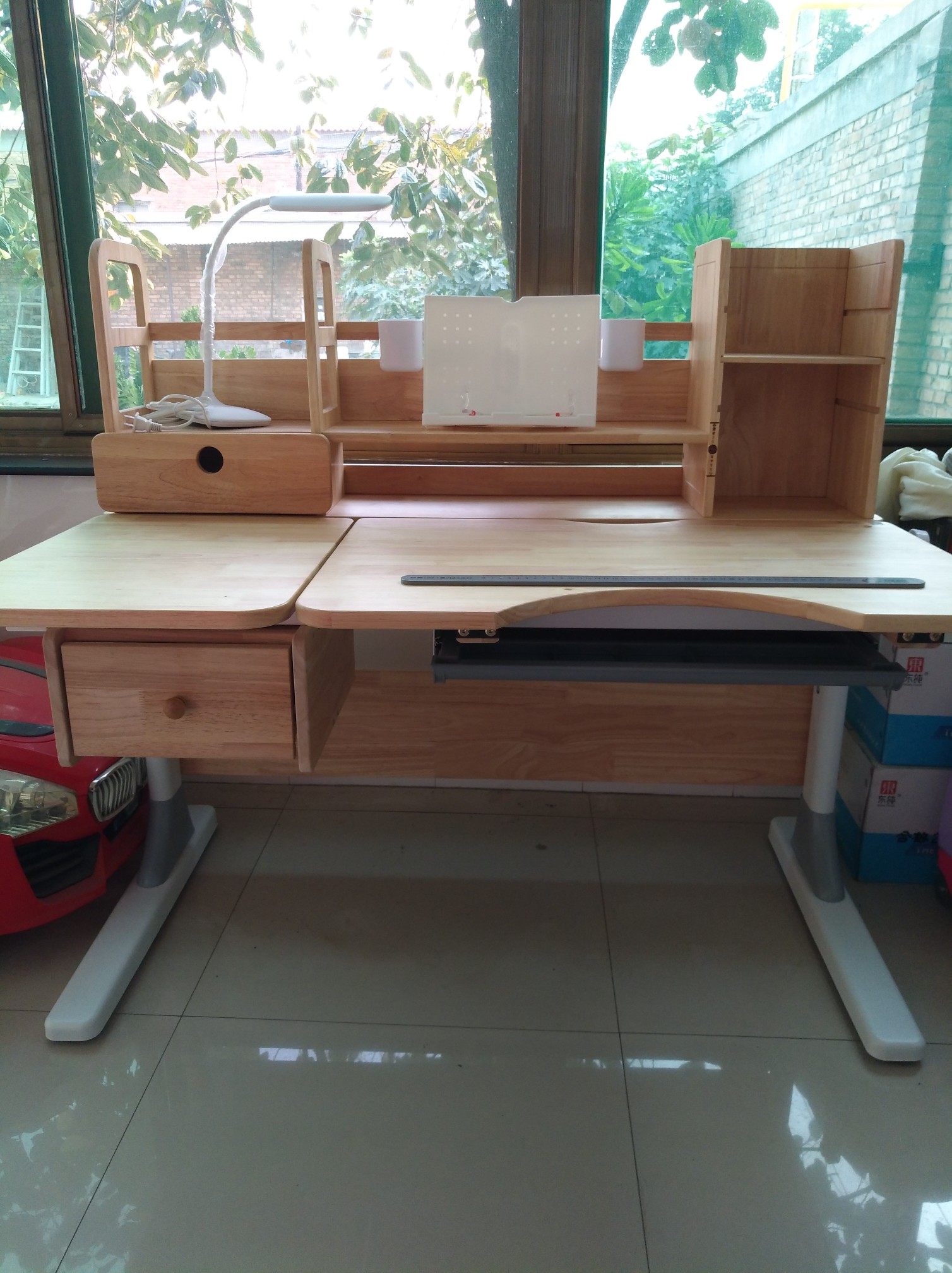 很好安装,整体工艺质量还是不错的。物流很快。也可考虑请卖家安装,确实挺费体力的,出了一头汗,外观材质:外观好看 工艺水平:做工精致 直观感受:质感很棒 结实稳定性:书桌结实,刚装好,孩子已经开始使用画画了。赞