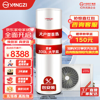 达人分享扬子YZRS-2FH3+YZXR-300/2FH3空气能热水器参数,好不好?经过亲戚的推荐,最终入手了这款热水器,整体物件重啊,我家住三楼,送货师傅送上去都好费劲,按装师傅非常专业,态度很好,加热速度也很快,就是送货有点慢,可能物件大,客服态度很好,回复问题快,哈哈!整体感觉,这是不错的选择。空气能热水器的优点有很多,比如:相对于加热量同等的热水器具有更高的热效率,会更加省电;空气能热水器由于不会使用燃气,因此不会向外界排放废气,更加的环保;噪音比较小;其适用的范围相对比较广泛,学校、医院、公司宿舍、别墅等都可以使用。用起来也很安全。活动购买价格也非常实惠。