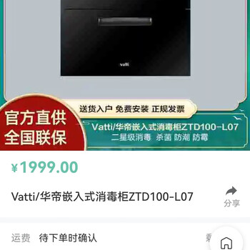点击>>查看华帝嵌入式消毒柜ZTD100-L07最新优惠底价>>